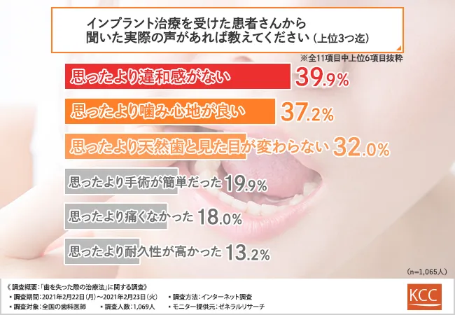 最後に、「インプラント治療を受けた患者さんから聞いた実際の声があれば教えてください(複数回答可)」と質問したところ、『思ったより違和感がない(39.9%)』と回答した歯科医師が最も多く、次いで『思ったより噛み心地が良い(37.2%)』『思ったより天然歯と見た目が変わらない(32.0%)』『思ったより手術が簡単だった(19.9%)』と続きました。