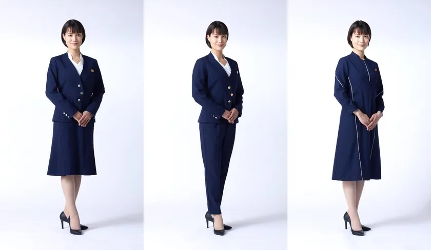 制服着用イメージ(左から本館で着用するジャケット×スカート、ジャケット×パンツ、アネックスで着用するワンピース)
