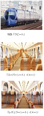 「ラピート」は、「レトロフューチャー」をデザインコンセプトとしており、人間味のある曲線と楕円窓が特徴で、通常は難波駅と関西空港駅を定期運行しています。座席は3列のゆとりある「スーパーシート」と4列の「レギュラーシート」で構成されており、それぞれ快適な旅をお楽しみいただきます。