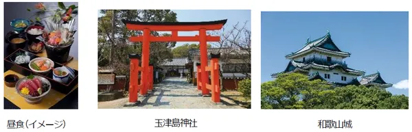 和歌山港駅到着後の行程では、黒潮市場の「紀州御膳」での昼食の後、万葉集ゆかりの地である和歌の浦にたたずむ「玉津島神社」を参拝し特別御朱印を授かります。