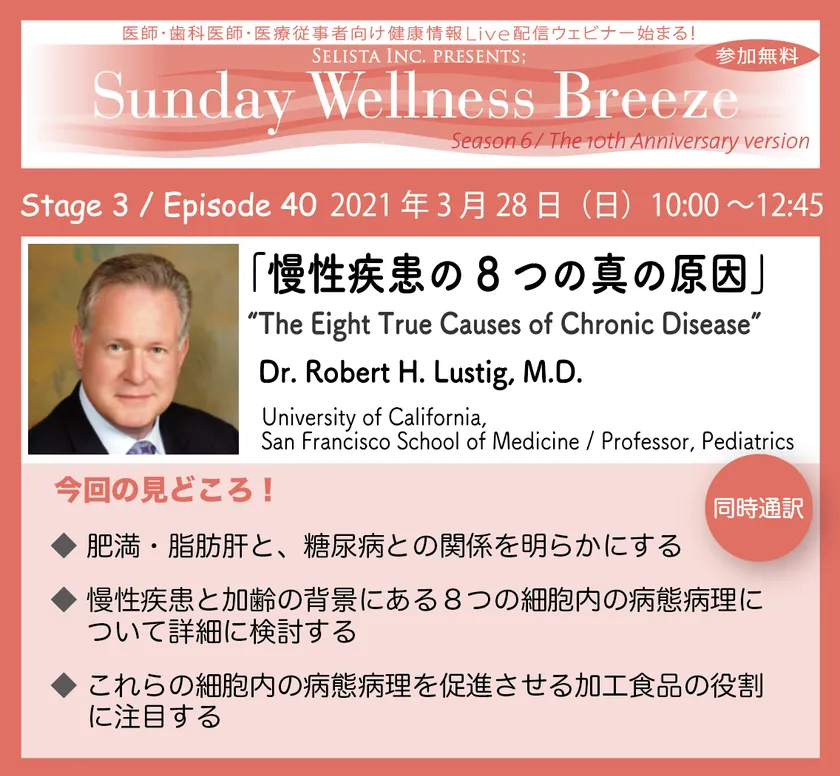 セリスタ株式会社(東京都千代田区、代表取締役:伊藤 承正)は、2021年3月28日(日)に、アンチエイジング・予防医療・栄養療法情報 無料Live配信Zoomウェビナー『Sunday Wellness Breeze』のSeason 6 Stage 3として、カリフォルニア大学サンフランシスコ校医学部小児内分泌教授のDr. Robert H. Lustig, M.D.による講演「慢性疾患の8つの真の原因 / The Eight True Causes of Chronic Disease」をサンフランシスコから生配信・同時通訳付きで開催します。
