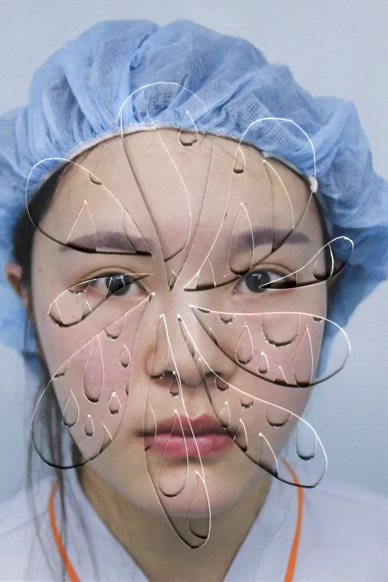 中国の美容整形外科で手術を受けた一般女性の顔写真をパソコンで復元し、ナイフで切り傷を入れた〈ビフォー&アフター〉、「美顔デザイナー」から提案された手術プランを作品化した〈美容外科手術診断〉を展示します。