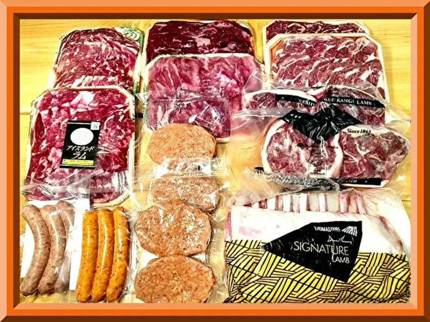 23,500円コース:穀物肥育ラム骨付き約900g前後・T-BONEステーキ1本・プレミアムマトンヒレ400g・プレミアムマトン肩ロース200g×2・羊ソーセージ(スモーク)3本・羊ソーセージ(チョリソー)3本・ラムバーグ200g×4・ラムタン250g