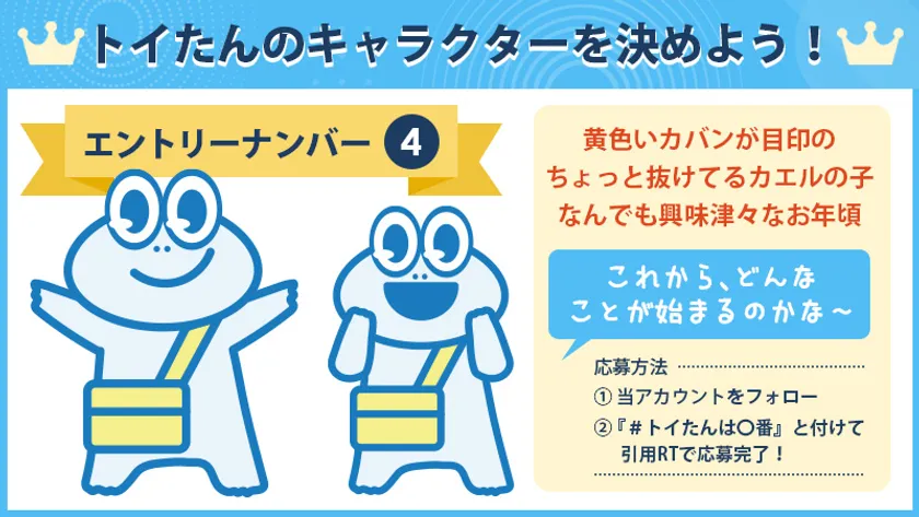 『トイレつまり修理受付センター』のマスコットキャラクター、通称:トイたんを4つの候補キャラクターの中から決めるため、キャラクター総選挙を行います!選ばれたキャラクターは『トイレつまり修理受付センター』の公式Twitterほか、公式サイトや関連メディアで使用されます。