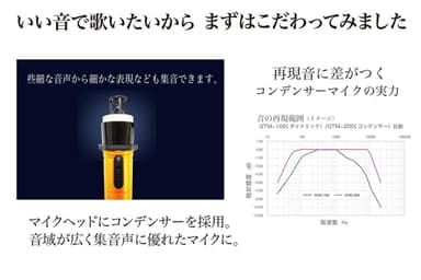 通常の業務用カラオケマイクの音響システムはダイナミックマイクロフォンですが、マイマイクProでは、エレクトリックコンデンサーユニットを採用し、高音から低音まで幅広い音域をクリアに再現しています。
