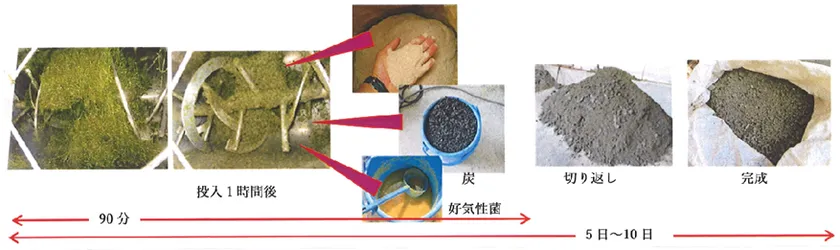 活性酸素処理機に水草投入→(1時間)→炭(水分調整剤)、米ぬか、好気性菌投入→攪拌(30分)→排出→切り返し(1~2日/回)→熟成(温度低下で確認)