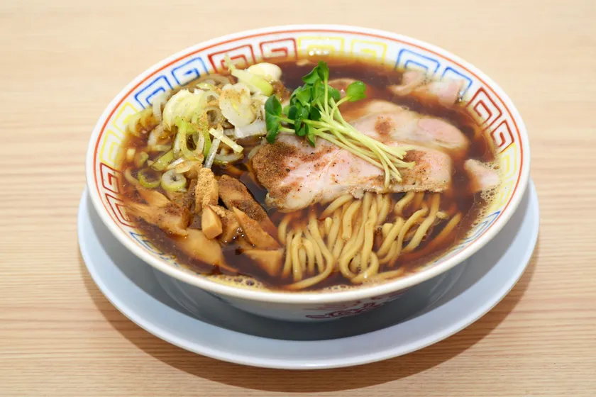 鶏から取ったスープに甘味のある甘露醤油ベースのタレとサバ節を加え、甘味の中にも魚介の濃厚な風味漂うWスープに、コシがあり、もちもちした食感の中太ストレート麺がよく絡む一杯です。