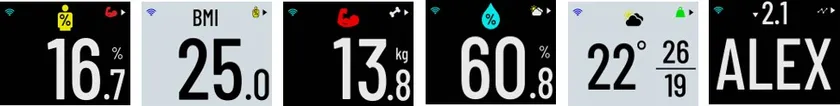 左から体脂肪率、BMI、骨格筋量、体内水分量、天気予報、ユーザー名