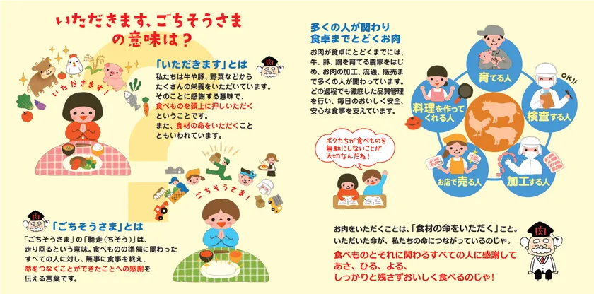 栄養豊かな食材に「いただきます」と「ごちそうさま」の感謝の言葉をまじえながら、“食材の命をいただく”ことへの理解、“食べものとそれに関わるすべての人への感謝の気持ち”を育むことを目的として制作いたしました。
