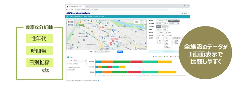 ・画面左は、各施設の時間帯ごとの来訪者の棒グラフで、各施設の傾向をとらえやすく可視化。
