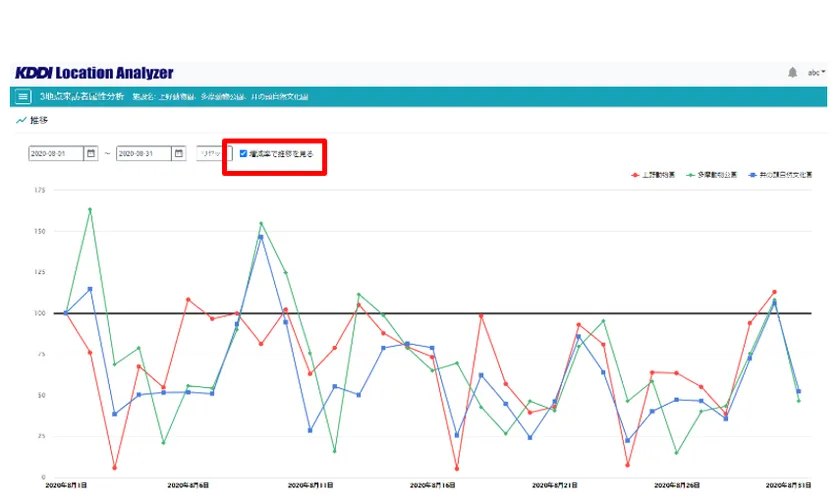 各施設とも、初日の来訪者数を100として、日別でどれだけ増減しているかの「増減率」の推移を折れ線グラフで表示。推計値に差がある施設同士の比較でも、傾向の差異を確認できます。