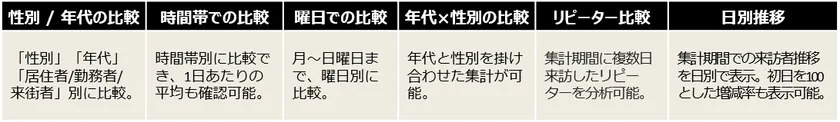 今回追加される新機能「3地点来訪者属性分析」は、3つまでの分析地点を選び、1画面上で来訪者の属性を分析できる機能です。チェーン企業等における、ベンチマークする近隣の競合店舗・施設と自店舗・施設との客層の比較や変化を把握したいというニーズの高まりを受け、「併用分析」や「3地点来訪者居住地分析」につづき新たに標準搭載されました。店舗に限らず、商業施設、公園、観光地一帯など、任意の場所をお客様自身で定義して比較分析できます。