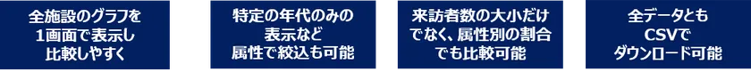 ・集計期間における各施設の日別の来訪者数推移を表示。それぞれの施設の客足等の比較を容易に可視化します。