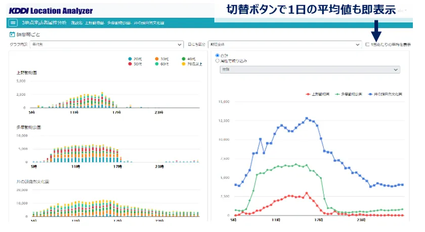・画面右は、各施設の時間帯ごとの来訪者数推移の折れ線グラフで表示。