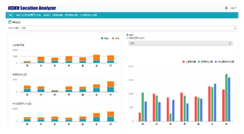 ・画面右は、曜日別の来訪者の推移を棒グラフで1つにまとめ、複数の施設間での人数の差や曜日毎の傾向を掴みやすく可視化。