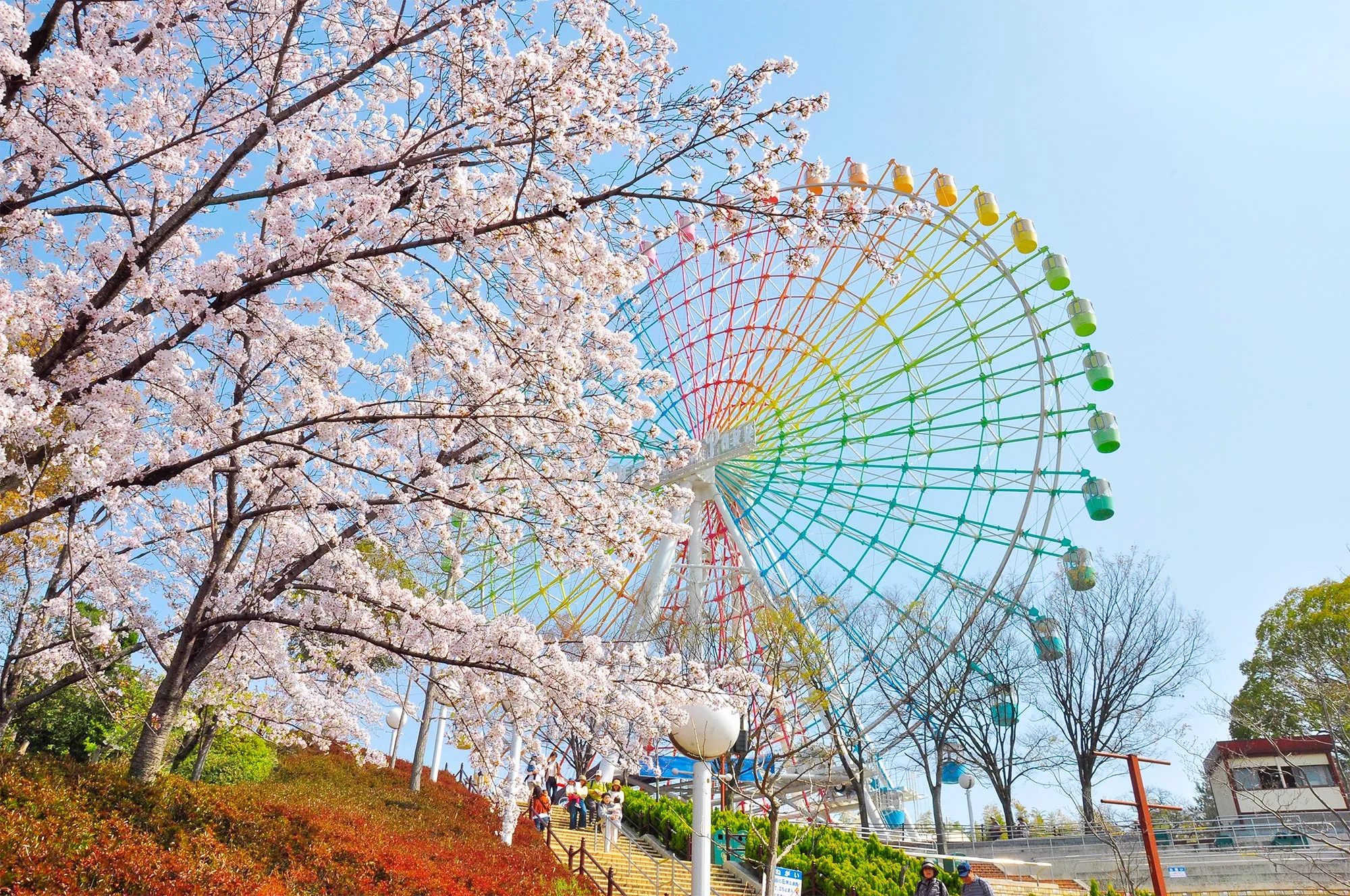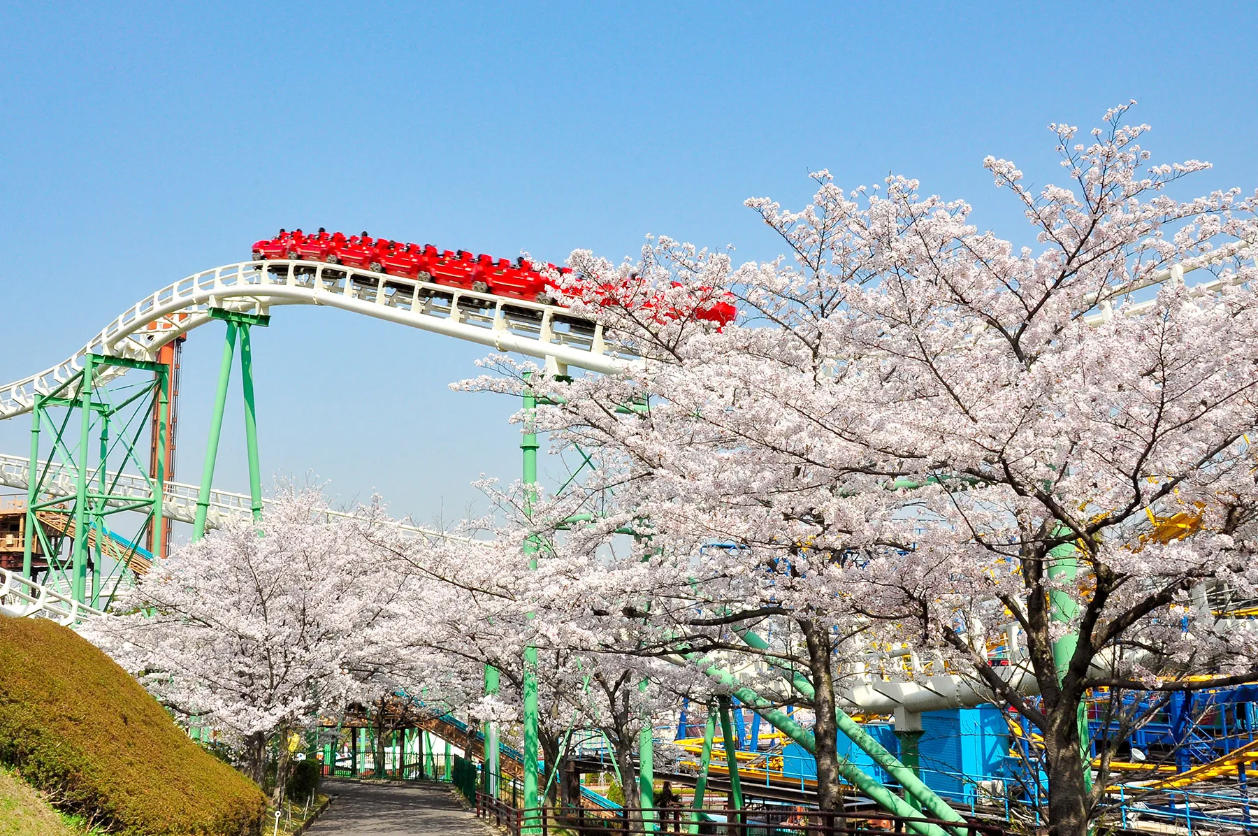 また、アトラクションに乗りながら眺める桜は、遊園地ならではの楽しみ方。ローラーコースターの「レッドファルコン」や「木製コースター エルフ」は桜の間近を通り抜けるため、高速で桜をお楽しみいただけます。さらに、観覧車「スカイウォーカー」からは園内の桜を一望でき、空中から一周約10分のお花見タイムもおすすめです。陽気な春のおでかけに、ひらかたパークの桜をご堪能ください。
