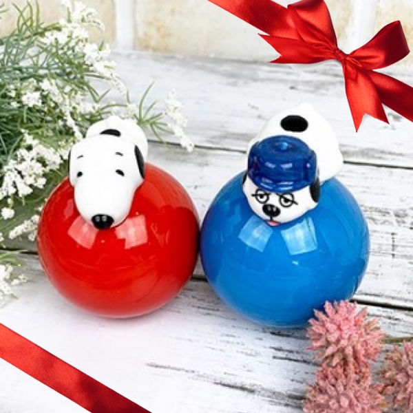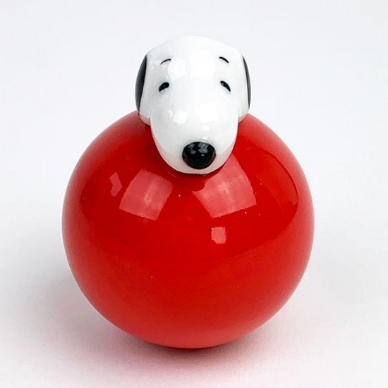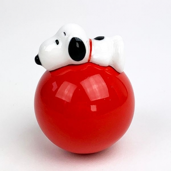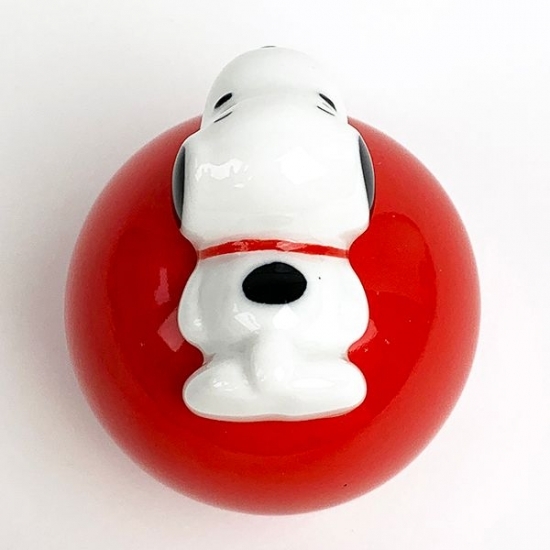赤くて丸いフォルムの本体に、スヌーピーが乗っかったオキアガリコボシです。