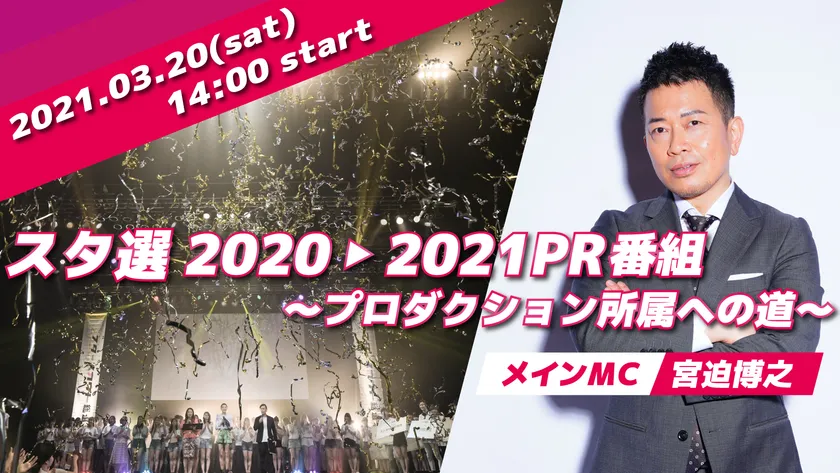 『スタ選2021PR番組→プロダクション所属への道~』を YouTubeにて2021年3月20日(土)14:00~に生配信 ~メインMCは宮迫博之、YouTubeの登録者数204万人超え 「ひなちゃんねる」加藤ひなたをゲストに迎えて~