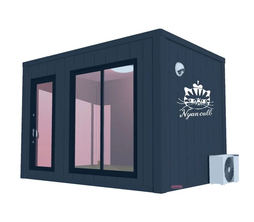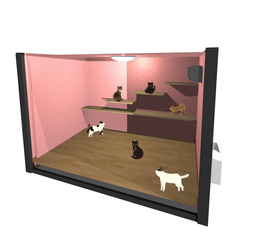 中古のJRコンテナをリノベーションし、照明や空調の基本インフラに加え、壁一面のキャットウォーク、猫には欠かせない採光や見晴らしの良さを考慮した大きな窓等、猫の生活の質を向上させる仕様とします。