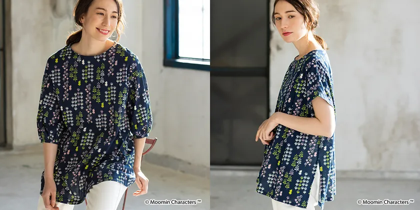 続いて、デイリーに使いやすいオーガニックコットン100%の天竺素材のシリーズは、お花畑にただずむリトルミイのグラフィカルなプリントのシリーズです。ゆったりラクな着心地なのに、華やかさもあるアイテムに仕上げました。こちらの柄で、トップス2型と、スカート、ワンピースをご用意しました。