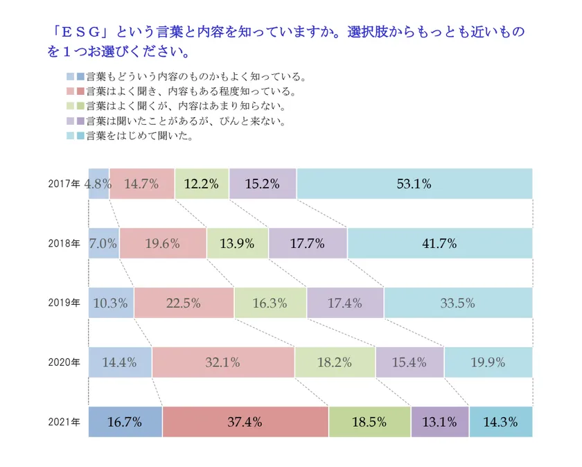 ■ESGの認知度は引き続き上昇し、過半数に達した。認知度の高まりにより、ESGへの取り組みが投資先としての企業の価値を高めると理解されている。