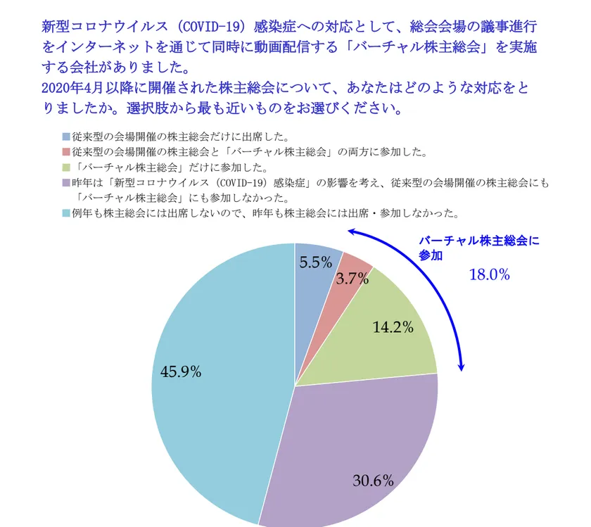 ■昨年「バーチャル株主総会」に参加したと回答した人は18%。そのうちの約4分の3が「インターネットをつうじて、自宅にいながら株主総会に参加できるのでよい。」と答える。