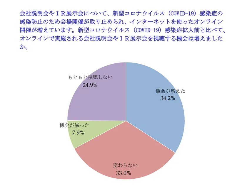 新型コロナウイルス(COVID-19)感染症拡大前と比べて、オンラインで実施される会社説明会やIR展示会を視聴する機会は増えたか尋ねたところ、「機会が増えた」と答えた人が34.2%、「機会が減った」と答えた人が7.9%と、全体としては増加という結果となった。コロナ禍によって、個人投資家のインターネットでのIR情報の収集が促進されたと判断される。