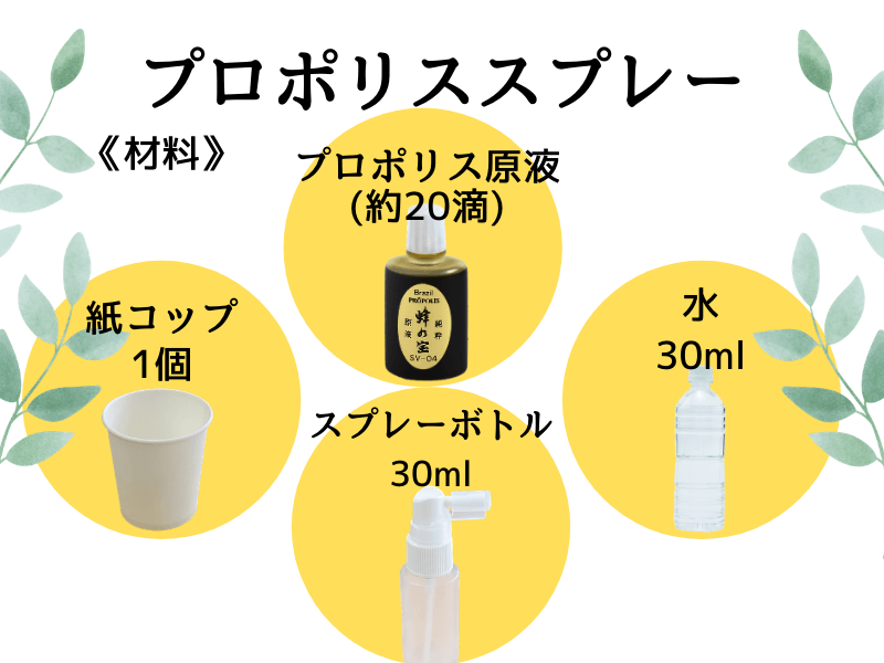 なぜならプロポリス原液さえあれば、自分で簡単に安全で健康的な「プロポリスのどスプレー」が作れるからです!ドラッグストアなどで販売している「プロポリスのどスプレー」も手軽で良いのですが、蜂の宝本舗ではご自身で作っていただく事をオススメします。