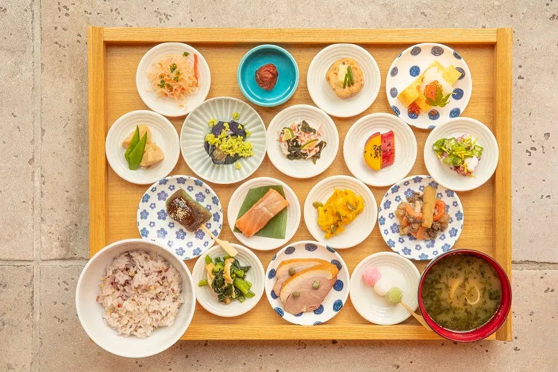 Withコロナ対応を意識して以前のバイキングスタイルから、来店人数を絞った限定のランチセットとし、大人の方に嬉しい「京のおばんざい」をモチーフにした優しい味わいの料理を品数豊富に小皿へ盛り付けました。