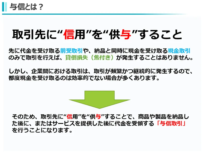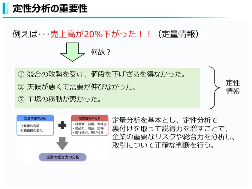 【概要】数字では測れない定性情報の要素とそれらの情報を集める際のポイント、決済条件や物流などの取引の流れをつかむための「商流」を把握するポイント、危険な取引形態、与信管理ルールの構築や運用について学びます。