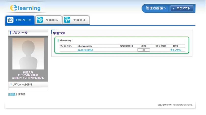 管理者が利用者ごとに受講期間、受講の進捗状況を一覧で確認することができます。