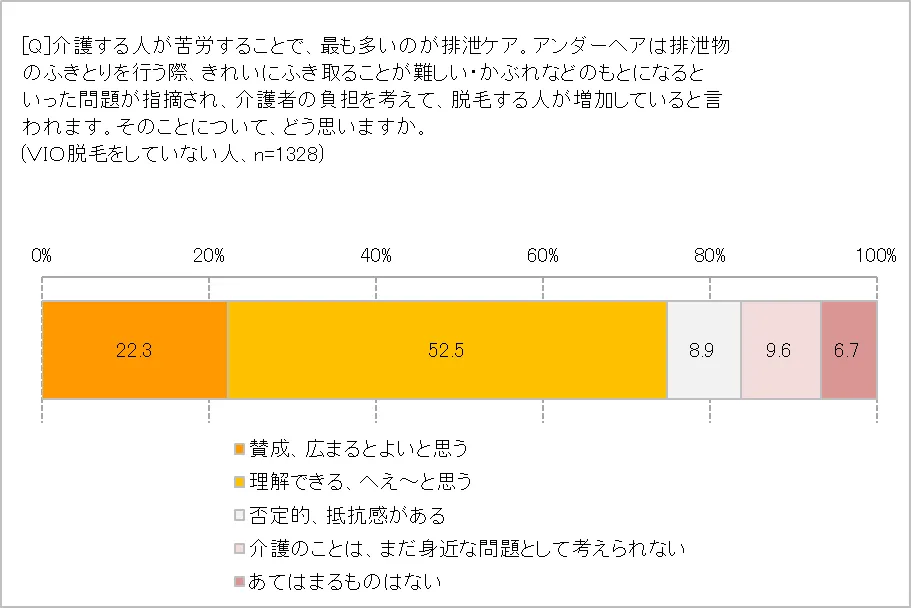 「人生100年時代」の今。長い人生をよりよくするには、何が必要なのでしょうか? 今回は、近ごろ耳にすることが増えた「介護脱毛」にフォーカス。介護される側になったとき、より快適に過ごすヒントをリサーチしました。介護脱毛とは、将来、自分が介護されることを想定して、アンダーヘア(VIO)の永久脱毛をすること。VIO脱毛という言葉の認知度は59.8%にのぼり、レーザー脱毛した人の5割がVIO脱毛を体験ずみですが、「介護脱毛」の認知度はまだ低め。しかし、言葉の内容を説明したあとでは、「賛成」や「理解できる」が合わせて74.8%に上り、「介護脱毛したい」という回答も半数を超えていました。