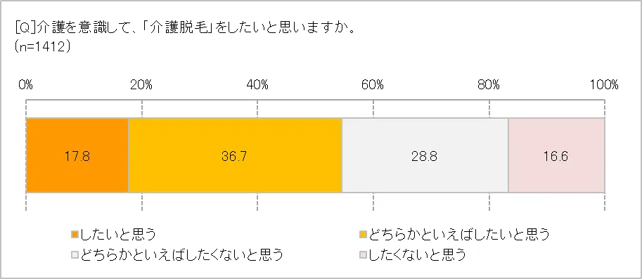 「介護脱毛」に対する読者の反応はおおむね好意的。「みんながやるべきとは思わないけど、自分の家族にはしておいてほしいし、自分自身もしておきたい」(30 代・フルタイム)、「介護してくれる人のことや、自分の肌のかぶれや不快感を考えると、必要だと思う。VIO脱毛は流行りとか若者文化と思われがちだが、そんな側面ばかりではない」(40代・フルタイム)などの声が集まりました。また、医療・介護職の人や家族の介護経験がある人からもたくさんの声が寄せられ、多くが賛成・理解できる派でしたが、一方で、抵抗がある派に票を投じた人のなかには、「介護する側だが、気になったことがない」(50代・フルタイム)と、いうかたも。また、明確に「賛成」「抵抗がある」と答えられない人や、まだ自分ごととして考えられないという人も目立ち、「理屈はわかるが恥ずかしい」(40代・専業主婦)、「初めて知って驚いた」(30代・専業主婦)のようなコメントも寄せられました。