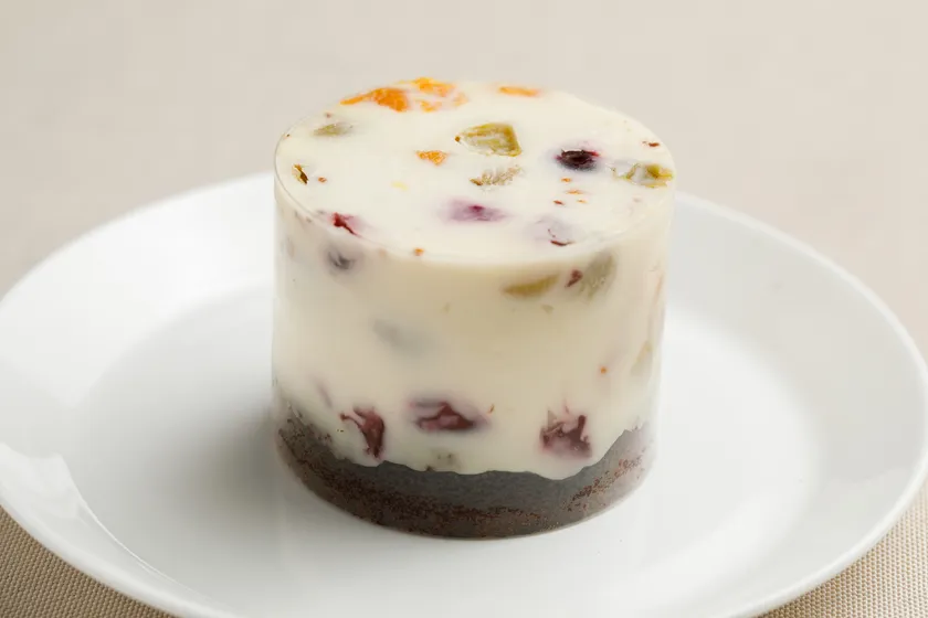 その複雑性が魅力のお酒であるワイン。スイーツにも複雑性を実現できるよう、「層」を意識しました。また、ドライフルーツやクリームチーズ等、ワインに合うエッセンスたっぷりの特製スイーツです。