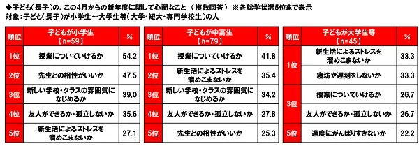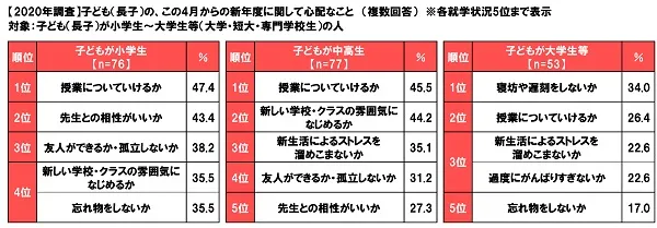 大学生等の母親では「友人ができるか・孤立しないか」が今年は3位に