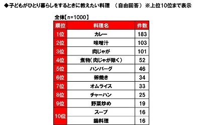 そこで、全回答者(1,000名)に、子どもがひとり暮らしをするときに教えたい料理を聞いたところ、1位「カレー」(183件)、2位「味噌汁」(103件)、3位「肉じゃが」(101件)となりました。