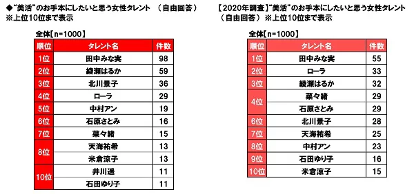 ◆ “美活”のお手本にしたい女性タレント 「田中みな実さん」が2年連続1位