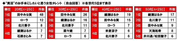 世代別にみると、20代と30代の回答では「田中みな実さん」(20代48件、30代26件)が1位、40代と50代の回答では「綾瀬はるかさん」(40代19件、50代17件)が1位でした。