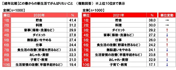 全国の20歳~59歳の女性(全回答者:1,000名)に、この春(4月)からの新生活でがんばりたいことを聞いたところ、1位「貯金」(38.0%)、2位「料理」(30.0%)、3位「ダイエット」(29.2%)、4位「家事(掃除・洗濯など)」(27.2%)、5位「仕事」(26.0%)となりました。