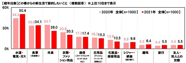全回答者(1,000名)に、この春からの新生活で、どのようなことにかけるお金を節約したいと思うか聞いたところ、1位「水道・電気・ガス」(50.4%)、2位「食事(外食除く)」(34.1%)、3位「外食」(26.0%)、4位「衣類・ファッション用品」(20.3%)、5位「通信(スマートフォンやインターネットなど)」(17.4%)となりました。