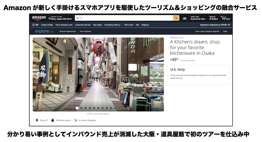 米アマゾンが2020年9月にサービス開始を発表した 「Amazon Explore(アマゾン・エクスプロラ)」。 独自に開発したスマホアプリを使って『ホスト』と呼ばれる案内役が 日本全国の観光名所、興味深い工房や通常入れない場所などを バーチャルに案内し、ショッピングへも誘導するサービスの展開へ尽力