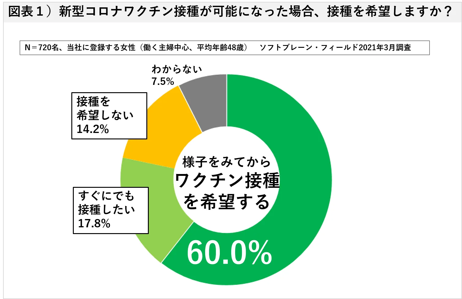 フィールド・クラウドソーシング事業を展開するソフトブレーン・フィールド株式会社(本社:東京都港区、代表取締役社長:木名瀬博)は、20代~50代の当社に登録する全国のキャスト会員720人(平均年齢48歳・働く主婦中心)を対象に、「新型コロナウイルスワクチン接種に関するアンケート」を2021年3月11日~15日実施しました。