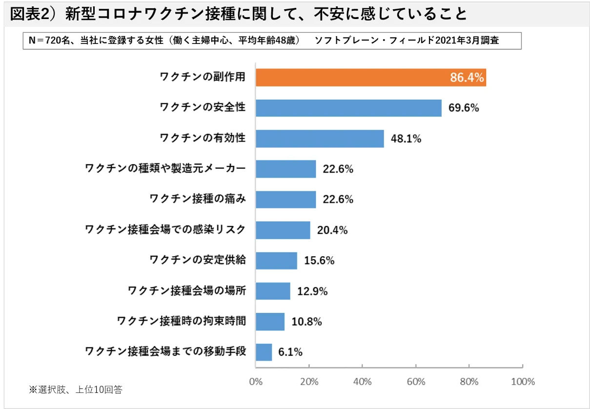 次に、新型コロナワクチン接種に関して、不安に感じていることを尋ねると、「ワクチンの副作用(86.4%)」が最多回答となり、「ワクチンの安全性(69.6%)」、「ワクチンの有効性(48.1%)」が続きました。