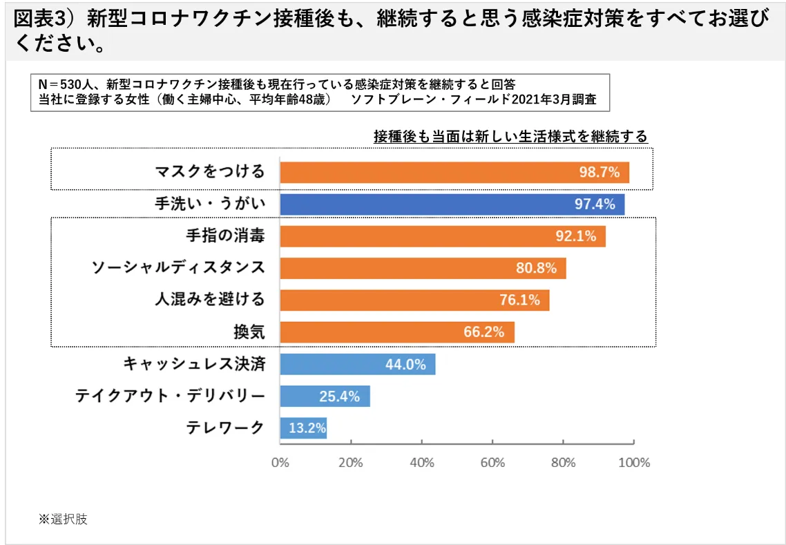 新型コロナワクチン接種後も感染症対策をすると回答した人(N=530人)に、継続すると思う感染症対策を尋ねると、「マスクをつける(98.7%)」、「手洗い・うがい(97.4%)」、「手指の消毒(92.1%)」が9割を越え、「ソーシャルディスタンスを心がける(80.8%)」、「人混みを避ける(76.1%)」や、「換気(66.2%)」などどいった、基本的な生活習慣である「手洗い・うがい」以外の、新型コロナウイルス感染拡大により浸透した新しい生活様式を多くの人が継続の意向があることがわかりました。その理由としては、基本的な感染症対策が習慣化したことや、ある程度の終息が見込めるまでは、接種後も今の感染予防を心がけるといったことが挙げられました。
