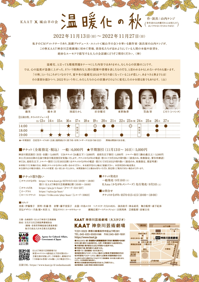 KAAT神奈川芸術劇場 ×城山羊の会、『温暖化の秋 -hot autumn-』が2022年11月13日 (日) ~2022年11月27日 (日)にKAAT神奈川芸術劇場 大スタジオ(神奈川県横浜市中区山下町281)にて上演されます。
