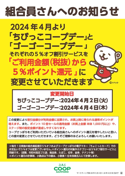 生活協同組合コープさっぽろ(以下、コープさっぽろ)では、2024年4月2日(火)からお店で実施している「ちびっこコープデー」および「ゴーゴーコープデー」の5%オフ割引サービスを「ご利用金額(税抜)から5%分をポイント還元」する方式に変更いたします。