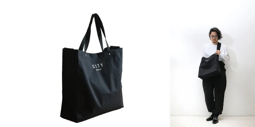ハイセンスなブラックカラーに、分かる人には分かるシティヘブンのロゴ。メイン素材にはどんなファッションにも親和性の高いキャンバスを使用し、内側には万が一飲み物などがこぼれても拭き取れるようPVCコーティングを採用。デザインのアクセントになっている大きめのショルダーストラップはトレンドを押さえて存在感抜群。大きくひらく開口部にはマグネットスナップが内蔵されており開閉はラクラク。さらにインナーポケットは取り外すことができ、流行りのサコッシュとしても使えます。