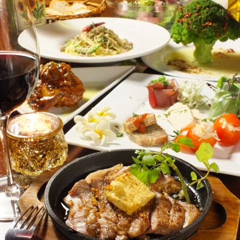 5種の前菜盛り合わせのほか、丸ごとブロッコリーのガーリックオイル、牛肉の鉄板ステーキなど7品と120分飲み放題つきです。