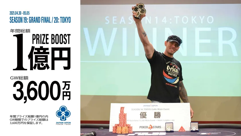 ことし初回のライブ大会は、大型連休にあわせて東京銀座のザ・バグースプレイスで行う「Season 20:Tokyo」で、6日間で35トーナメントを実施します。プライズ総額は3,600万円で、このうち「Tokyo Main Event」は総額1,000万円(優勝者は300万円)、「Grand Final Main Event」は総額700万円(優勝者は200万円)、サイドトーナメントは33トーナメントで総額1,950万円を提供します。