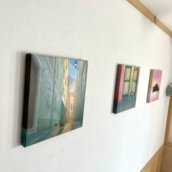 【内容】 「かず」と「りえ」の夫婦ユニット 「いろどりあつめ」 による絵画の展示を、CAFETELの館内の様々な場所に行いま